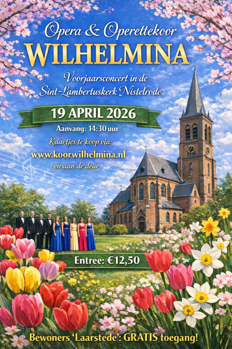 Tijdens het voorjaarsconcert van Opera & Operettekoor Wilhelmina hoor je bekende en verrassende stukken uit opera en operette in de sfeervolle Sint-Lambertuskerk in Nistelrode. Een muzikale middag vol samenzang, kleur en energie! π·